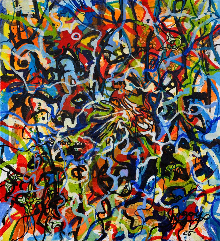 Ngoyes Malerei bewegt sich an einer produktiven Schwelle zwischen Figuration und Abstraktion. Maskenhafte Gesichter treten zunächst als erkennbare Formen hervor, lösen sich jedoch zunehmend in ein dichtes Geflecht aus Linien, Farbfeldern und gestischen Spuren auf. Die Malerei scheint durch diese Formen hindurchzugehen – sie zu überdecken, zu fragmentieren und zugleich immer wieder neu hervorzubringen. Was zunächst als Gesicht erscheint, verwandelt sich in ein vibrierendes Bildfeld, in dem Figur und abstrakte Struktur untrennbar miteinander verbunden sind.